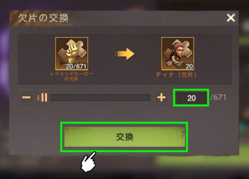- ③レジェンドヒーローの欠片を対象のヒーローの欠片に20個交換する