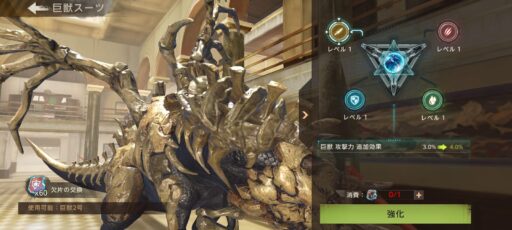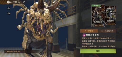 巨獣1号(ゴリラ)専用の巨獣スーツ「装甲機動」と、巨獣2号(恐竜)専用の巨獣スーツ「玄骨巨霊」について、合成・強化に必要な欠片の数および効果内容について記載しています。