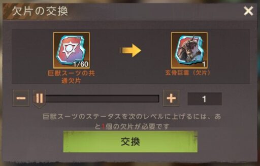 合成(作成)には、巨獣1号(ゴリラ)、巨獣2号(恐竜)のそれぞれ専用の欠片が100枚必要です。