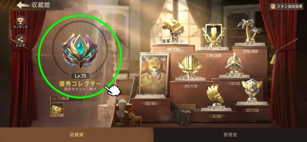 ここではコレクションポイントのレベルに応じて報酬を獲得でき、追加効果の内容が確認できます。
