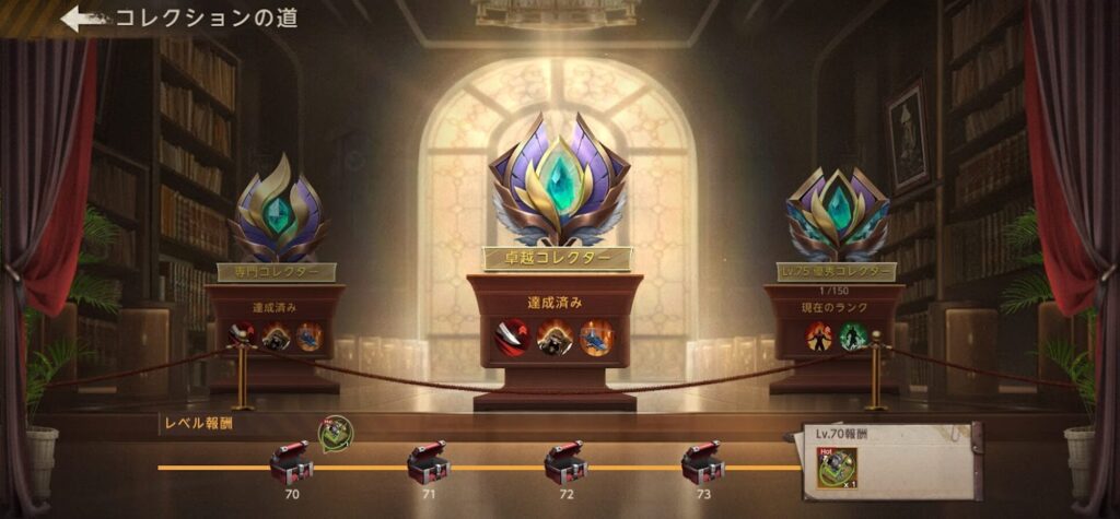 一定のコレクションレベルに到達するごとに、○○コレクターの名称が変わり、各種追加効果が付与されます。