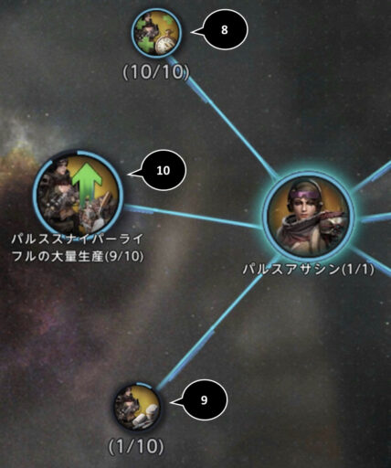 | パルススナイパーライフルの大量生産 | パルスアサシンの訓練にかかる資源消費減少 |