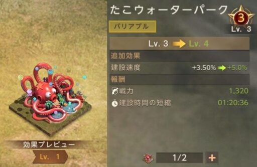 「たこウォーターパーク」のみ何故か価値の低い、建設速度と研究速度が上がるタイプのものになっています。シリーズコレクションのためにどうしても入手したい場合で無ければ交換優先度はとても低いです。(入手しやすい「装飾ボックス(ベーシック)」に入っているものです)